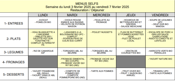 MENU CANTINE DU 10 AU 14/02/2025